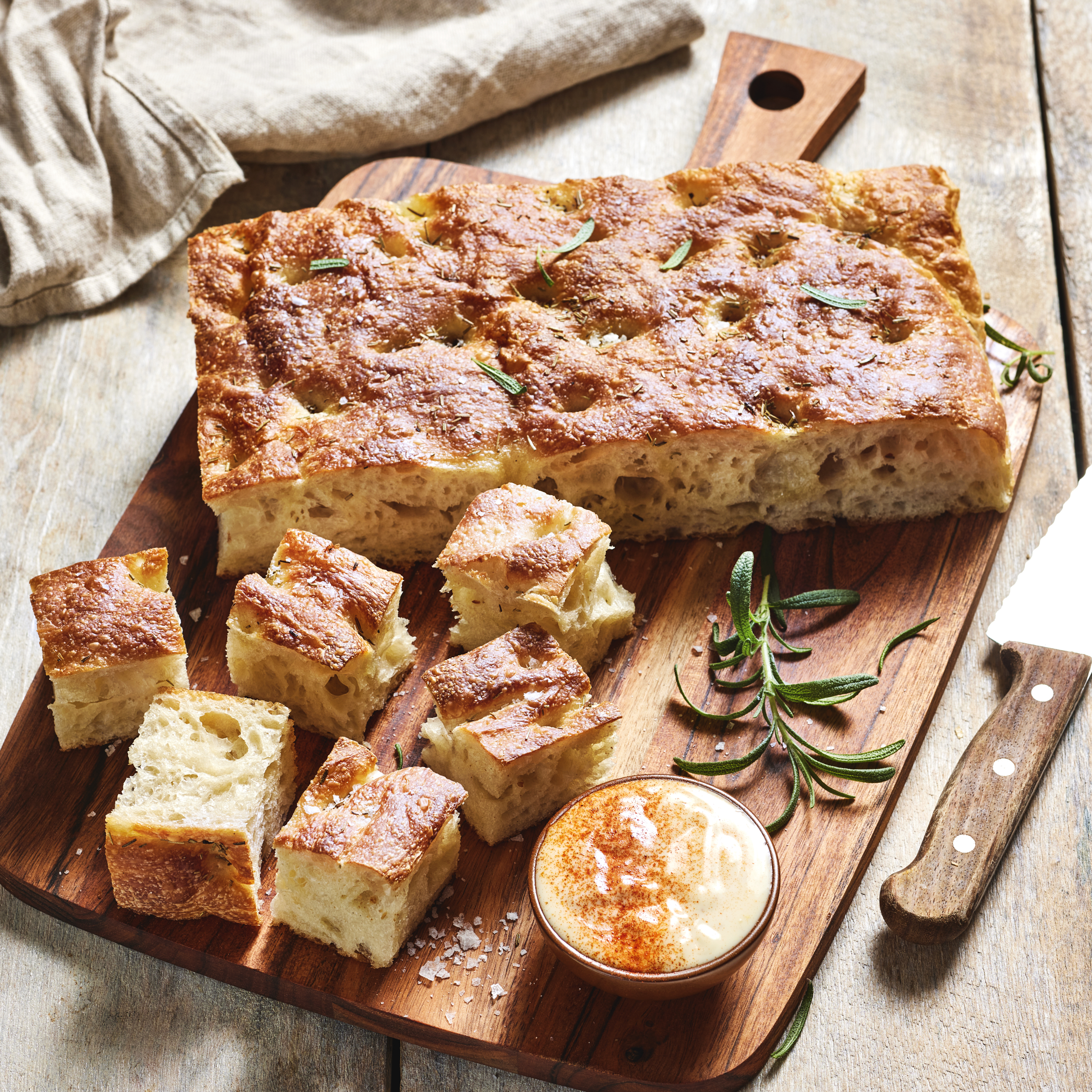 3 skiver focaccia fra Kveitemjøl bakeri servert med aioli fra Metervare (Hvete(gluten), egg, sennep, melk)